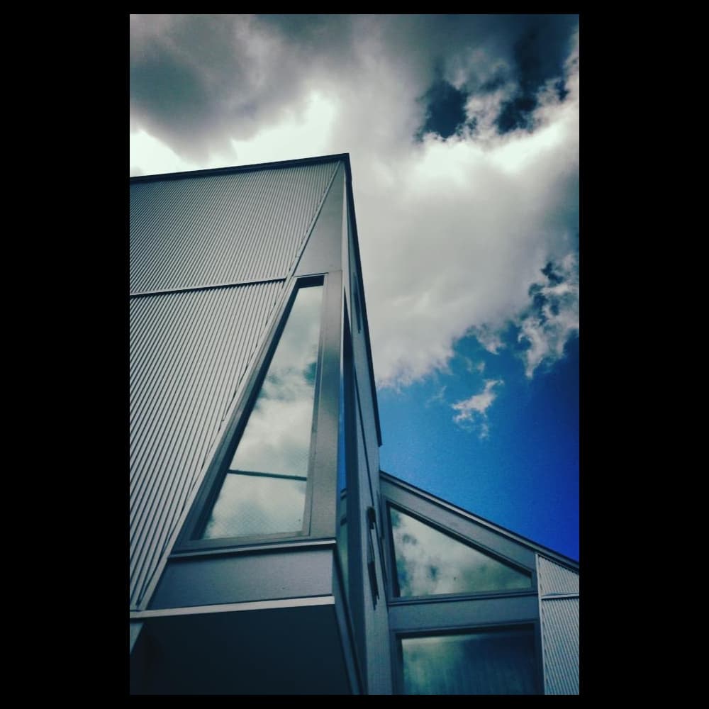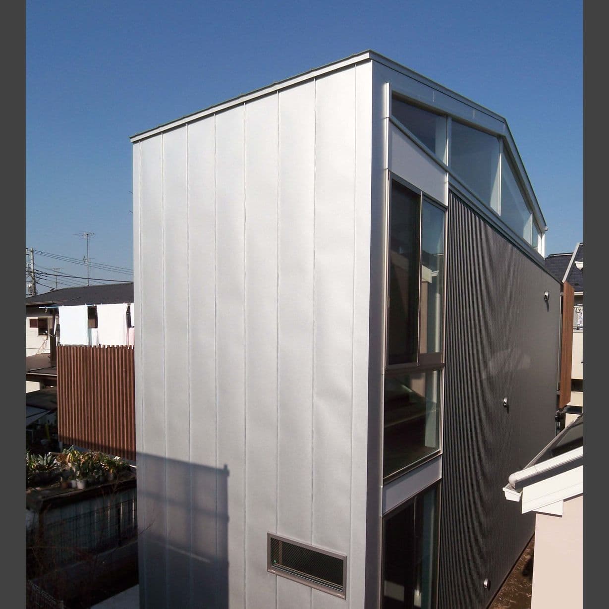 住宅に囲まれた旗竿敷地でありながら、室内から空を見たい。建物側面のハイサイドライトはリビング吹抜けに面して設けられ外観からは想像できない開放感を有する。